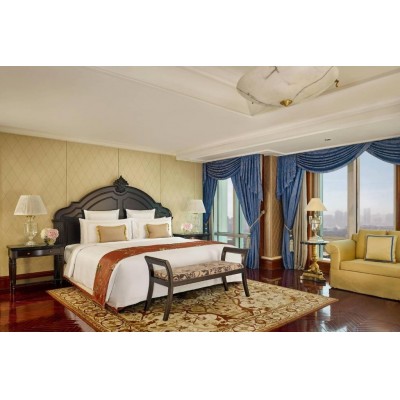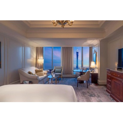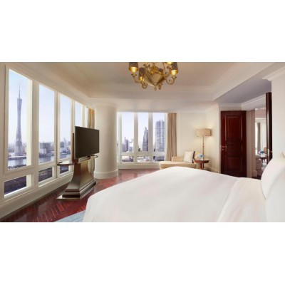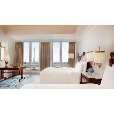 The Ritz-Carlton, Guangzhou, is a luxury destination in South China, situated in the heart of Zhujiang New Town, Tianhe District. Located along the Pearl River, it is just 1 km from Zhujiang New Town Metro Station and a 5-minute walk from the Guangzhou Opera House. The hotel offers an outdoor heated swimming pool, five dining options, a spa, and a fitness center. The Ritz-Carlton, Guangzhou is a 10-minute walk from Friendship Shopping Center or Xingsheng Road Bar Street and a 10-minute drive from Guangzhou East Railway Station. Taikoo Hui Plaza and Pazhou Shopping Center are a 15-minute drive away. Baiyun International Airport is approximately 45 km away, a 40-minute drive. The Ritz-Carlton's luxurious guest rooms are located on the 20th floor and above, offering city or Pearl River views. Each elegantly decorated room features a flat-screen TV, DVD player, and marble bathroom. The Ritz-Carlton Spa offers a variety of massage treatments, a spa tub, and a beauty salon. The Club Lounge blends modern elegance with minimalist comfort, providing an extra touch of luxury. Guests can enjoy private training sessions or yoga classes at the 24-hour fitness center. The hotel's five main restaurants and bars serve a variety of Cantonese and Western cuisine. Lai Heen, the signature Cantonese restaurant, was awarded a Michelin star in 2019. Churchill Bar and Pearl Lounge offer live music and drinks. The spacious dining and meeting facilities cover over 3,300 square meters, including a large pillarless grand ballroom spanning 1,209 square meters.